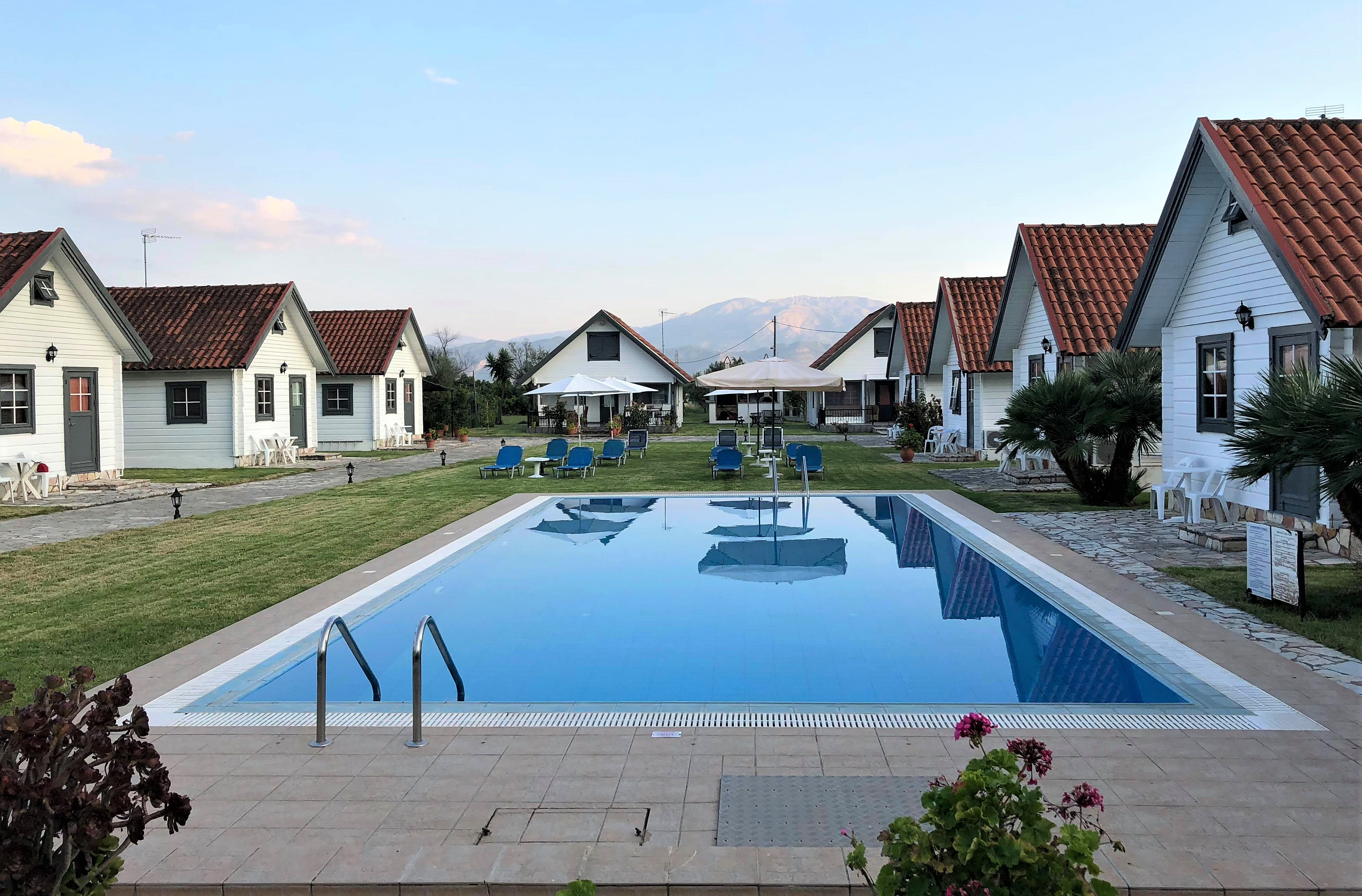 All studio villas include a fully equipped kitchen, and air conditioning, two single beds and one double, accomodates 4 persons, Wifi, TV, Shower, Towels, shared Outdoor pool, free parking outside and daily songbird wake up call, and only 10 min to the nearest beach